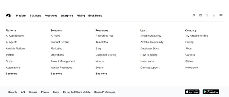 Footer navigation serves as your site’s safety net, capturing users who’ve exhausted primary navigation options. Poor footer design loses potential customers at the worst possible time.