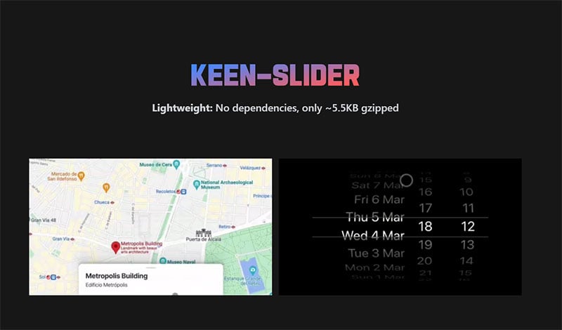 | Keen Slider | Framework-agnostic API, plugin architecture, custom friction physics, snap points, mutation observer integration | 5KB core library, TypeScript support, tree-shakeable modules, requestAnimationFrame timing | React, Vue, or Angular applications requiring minimal bundle size and maximum customization flexibility |