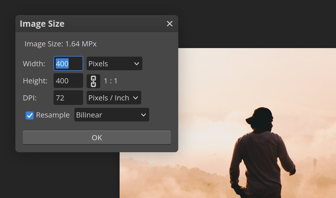 A box labeled Image Size will appear. Enter either the width or the height you want to scale to in the corresponding field, and the other dimension will automatically be calculated. Then click the OK button to apply the scaling: