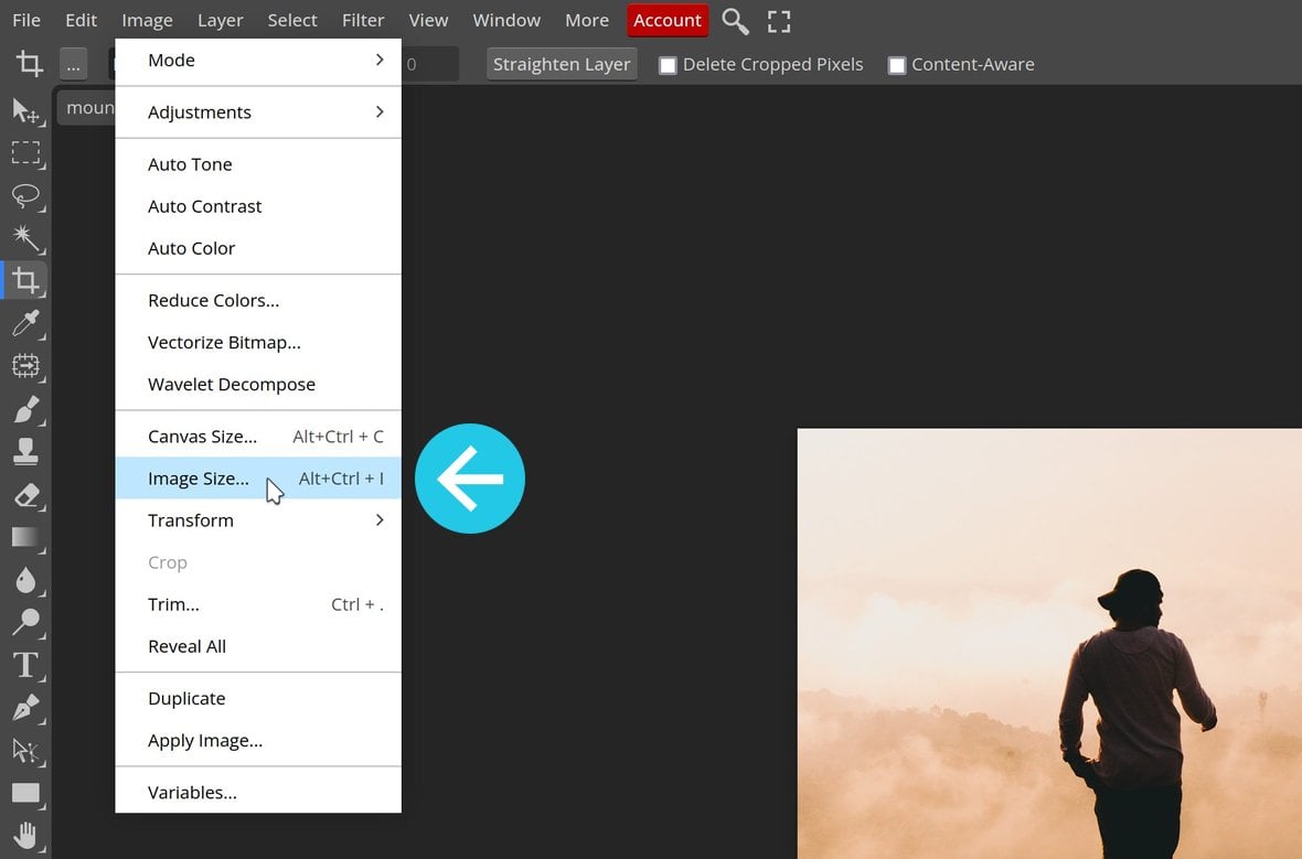 To scale an image, go to Image in the top toolbar, then choose Image Size… from the dropdown list: