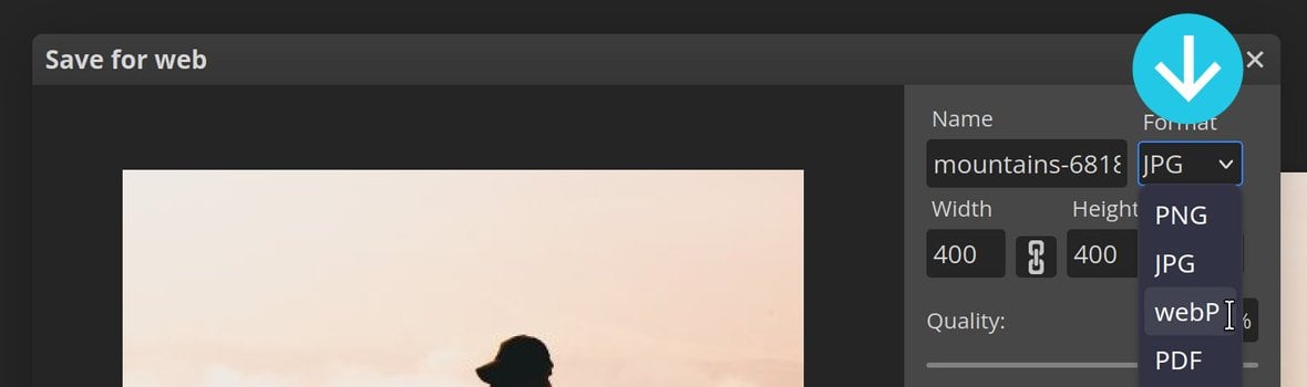 Repeat the process of adjusting the Quality slider, and determine which export format gives you the lowest file size. In this case webP gives us a slightly smaller file size of 11.5kb vs the JPG image size of 17.3kb: