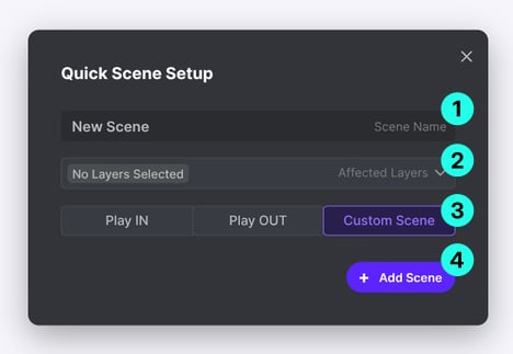 Click the + Add a new scene button 3 to create additional custom scenes through the Quick Scene Setup modal. You can create as many custom scenes as you want.