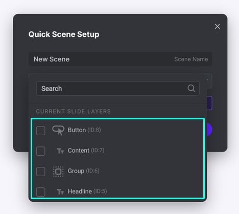 When the Scene Switcher is opened it displays a list of the Scenes in the current Slide.
