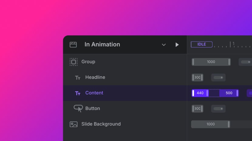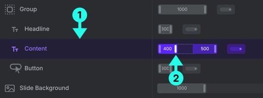 Within a Track you can also select a specific Keyframe. The selected Keyframe will be a brighter purple with a white handle at its right or left end 2. When a Keyframe is selected, it can be edited in the Animation Mode sidebar.