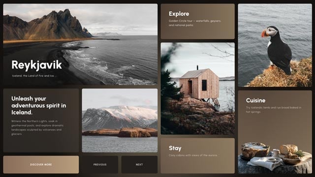 The Bento Grid Slider brings travel dreams to life with captivating visuals, lightbox pop-ups, and engaging call-to-action buttons. Perfect for lifestyle and travel brands, this template makes exploring destinations intuitive and inspiring. Invite users to immerse in seamless travel inspiration.